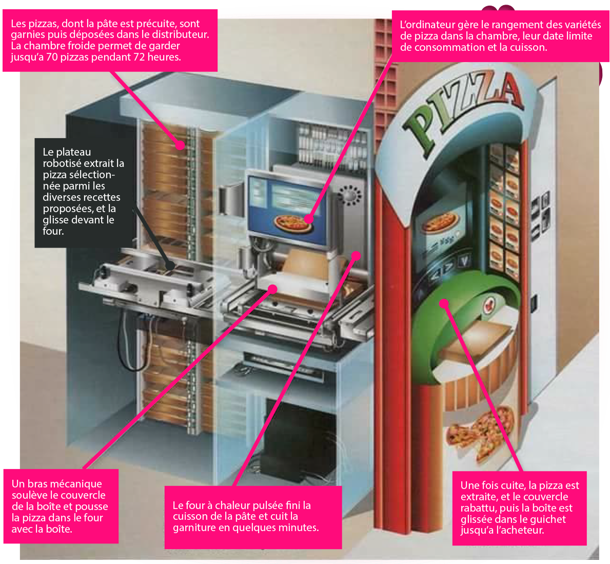 Les consommateurs se servent 24H/24 et 7J/7 et peuvent choisir leur pizza soit froide, prête en 30 secondes et à finir de cuire chez eux, soit chaude en 3 minutes et prête à déguster.